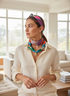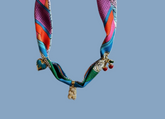 A vibrant fabric-wrapped necklace with bold, multicolor patterns and playful gold-tone charms, including a textured pendant, heart, and cherries. A unique piece that blends fun and style effortlessly.
